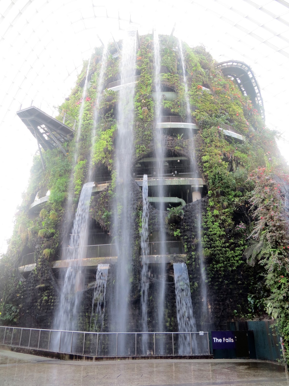 Inside there is a six story tall mountain covered in tropical foliage and complete with waterfall. The path leads to an elevator for a ride to the top. The walk down weaves inside and outside of the mountain for both distance and close in viewing of the plantings. There are also some great views of Marina Bay Sands.